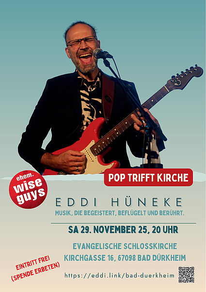 Am Abend wird es in der Schlosskirche musikalisch: Um 20 Uhr tritt Eddi Hüneke, ehemals Mitglied der Wise Guys, auf. Einlass ist um 19:30 Uhr. Eintritt frei, Spenden erbeten